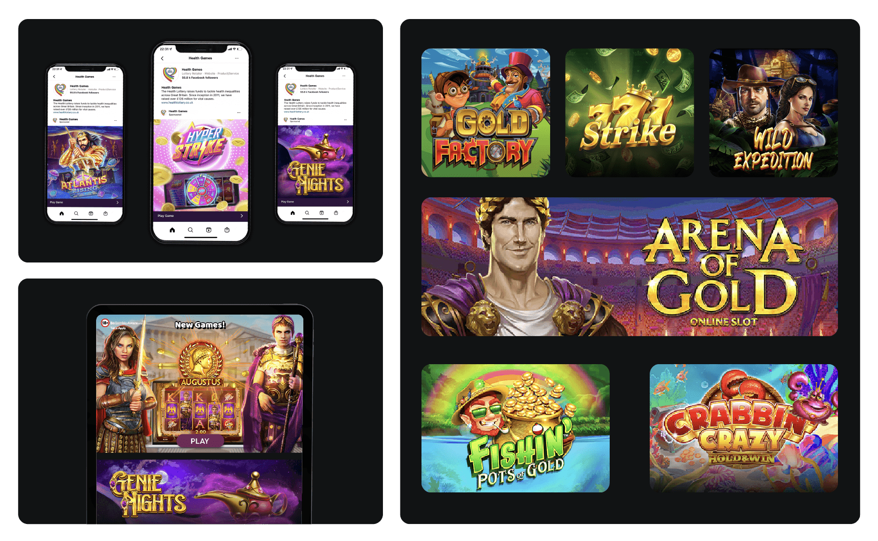 Health Games is an Slots and Casino brand that offers a wide range of popular game titles and gaming experiences. My focus was on creating visually engaging, high-impact visuals that captured the excitement of casino gaming. I incorporated assets from big name slot games like Starburst and Big Bass Bonanza, using their vibrant game assets and iconic characters to create instant familiarity.
