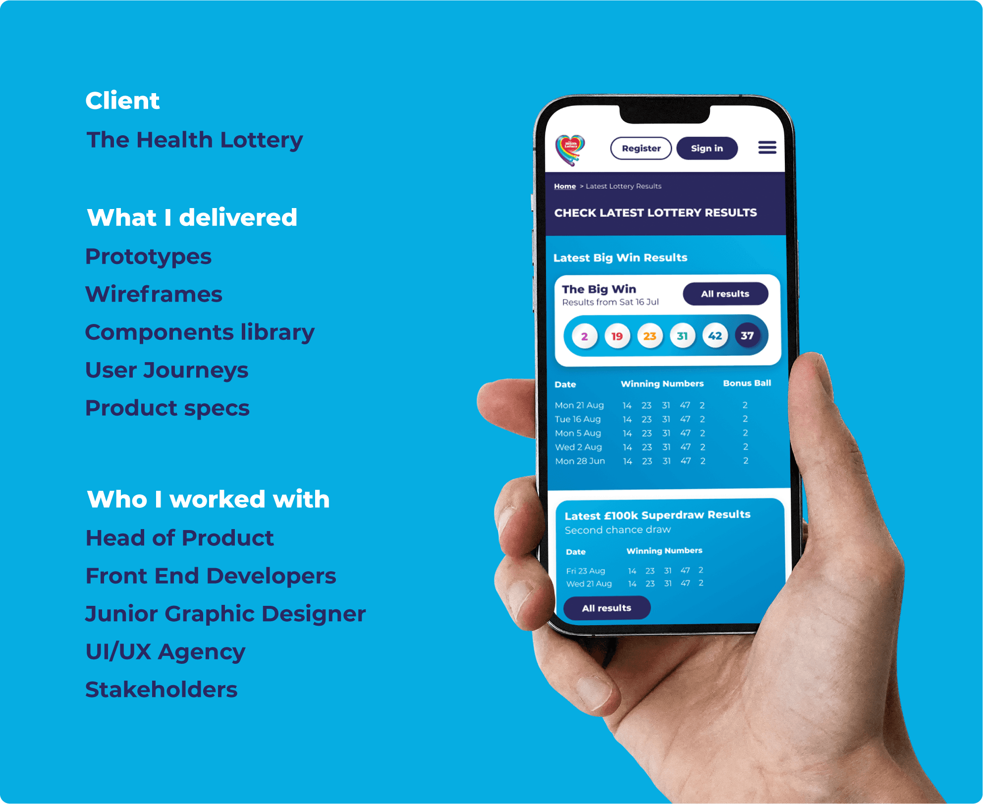 I designed dynamic landing pages, detailed Figma prototypes, and a scalable component asset library for The Health Lottery. I created a intuitive interfaces and streamlined user journeys that enhance engagement. I brought clarity and consistency to the product, lead collaborative workshops and fostered innovative solutions, ensuring every touchpoint feels seamless, playful, and accessible.